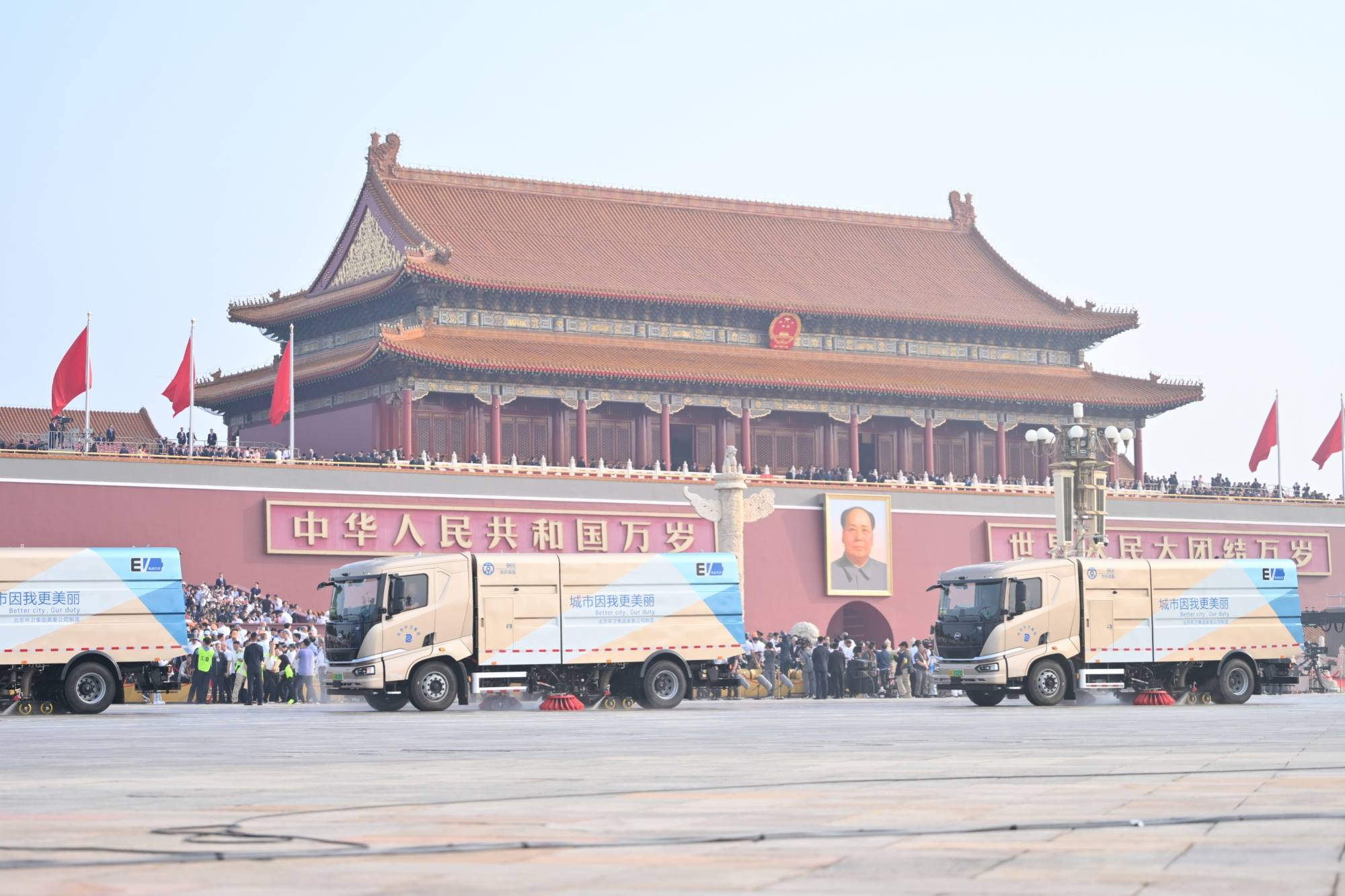 在阅兵正式开始前,suncitygroup太阳集团研发制造的23辆新一代洗扫车登上长安街,整齐编队作业。